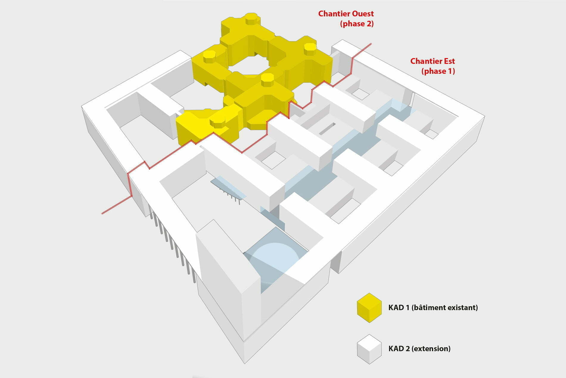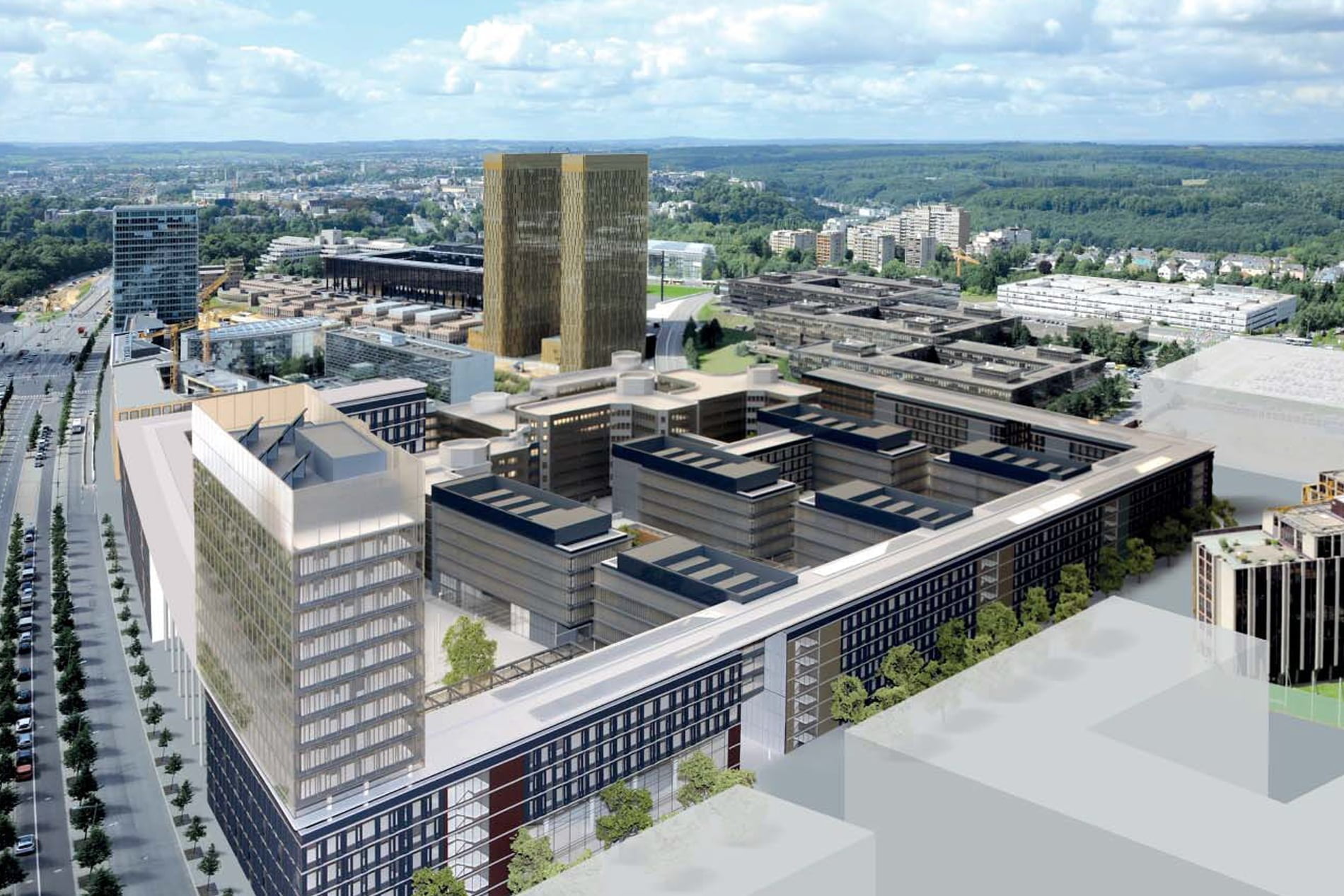 Les agences Tetra Kayer (Luxembourg), Art&Build (Belgique) et Sudio Valle (Italie) se sont regroupées pour répondre à l’appel d’offre lancé par le Parlement européen du Luxembourg. Elles forment une association momentanée, nommée Kad.am Architectes, en 2013 pour la réalisation des travaux. Notre mission englobait la reprise du projet en phase réalisation et chantier : avec une construction neuve de 190 000 m² (bureaux, salles de conférences, restaurants..) et une surface de 65 000 m² de transformation (anciens bureaux).